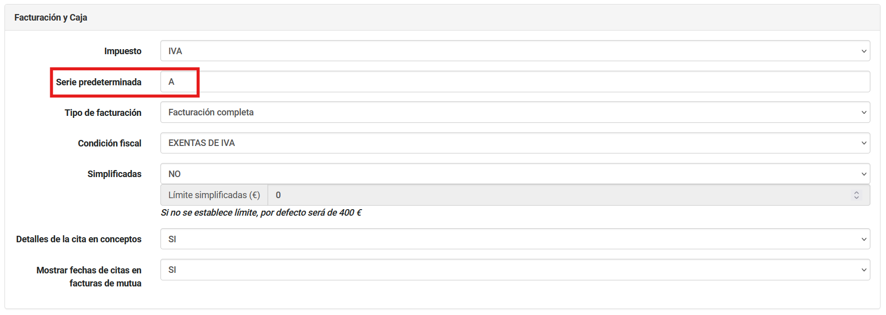 En caso de tener un profesional con una línea de facturación deberá configurar su Serie Predeterminada desde Configuración > Usuario > Facturación Usuario > Serie: