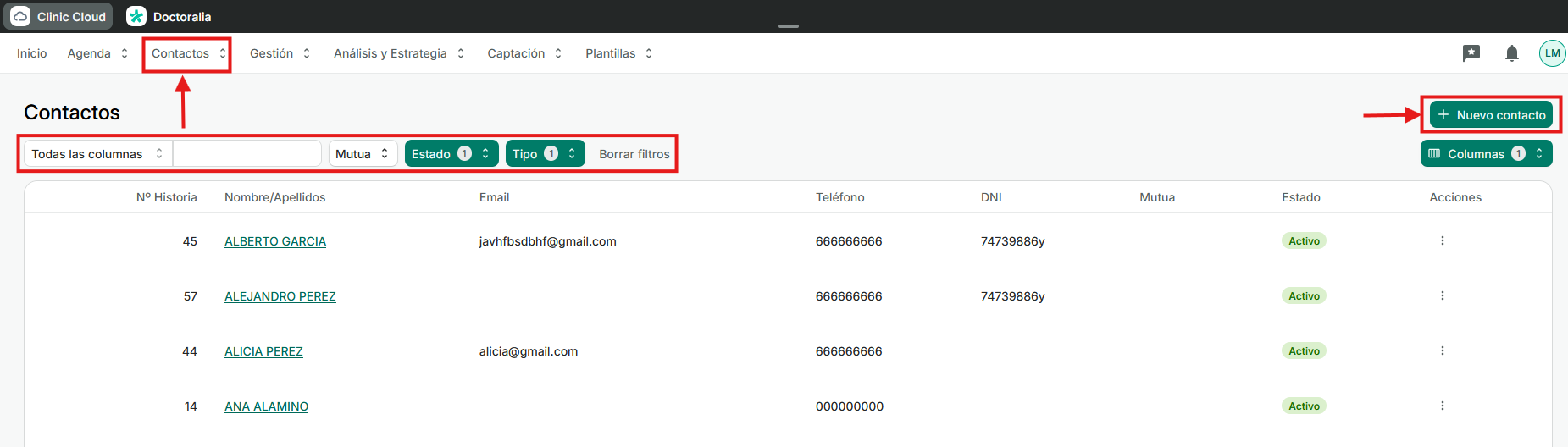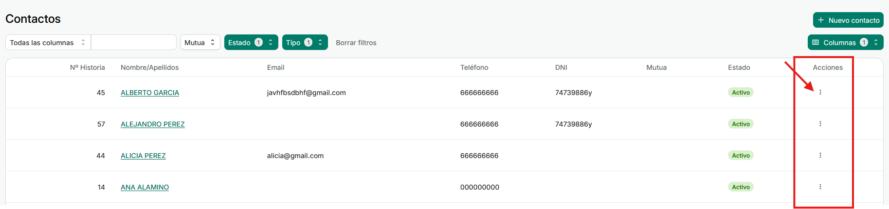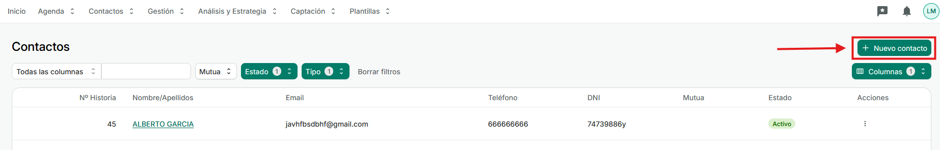 Para crear a un paciente nuevo debemos clicar en «Nuevo Contacto» arriba a la derecha: