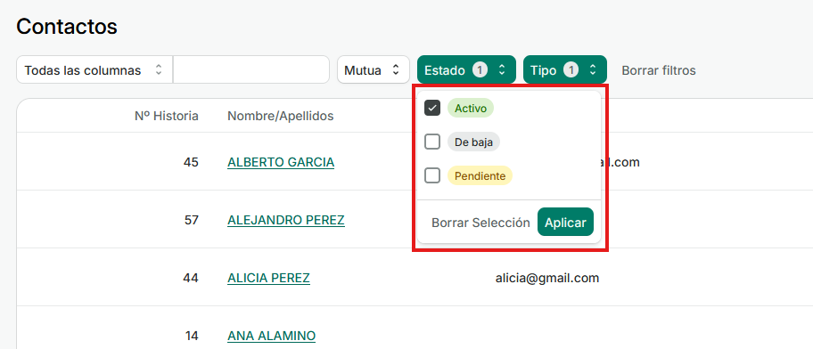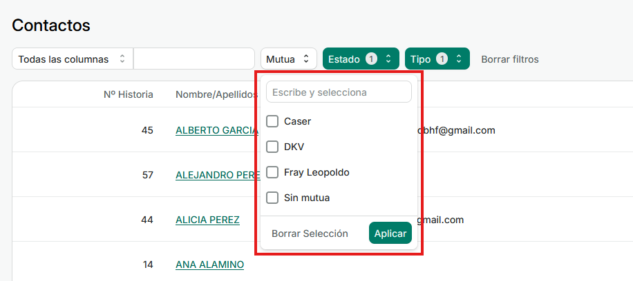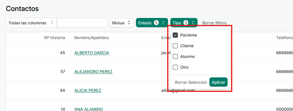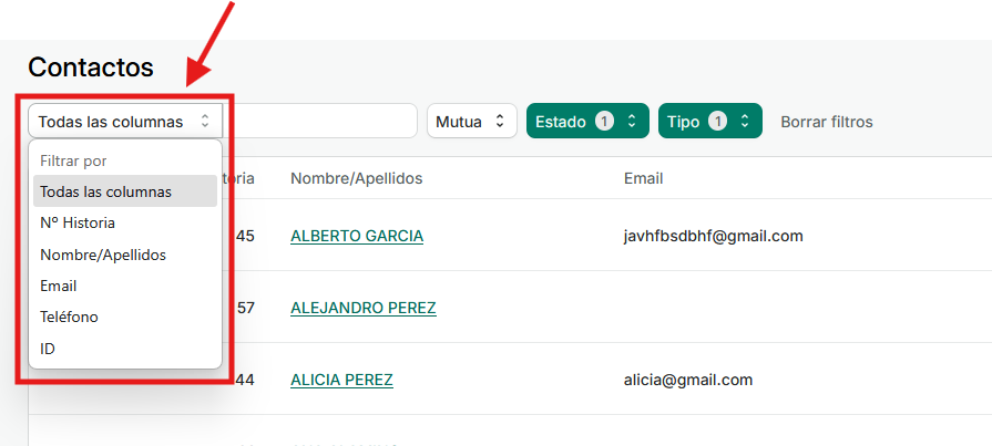 Ahora, los filtros de Nombre, Apellidos, Teléfono, Email, Nº de Historia y DNI se han unificado en un único campo, donde puedes elegir si deseas buscar en todos ellos a la vez o en uno específico: