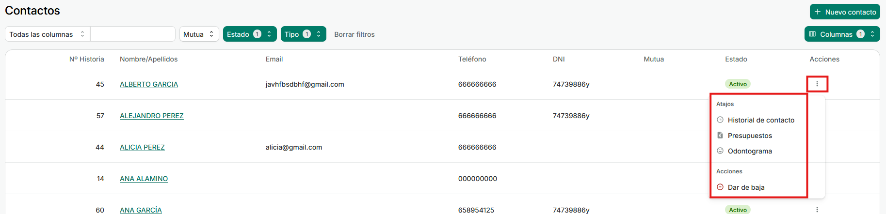 A la derecha de nuestros contactos, en Acciones, nos encontramos con un icono de tres puntos. A través del cual podemos acceder a: