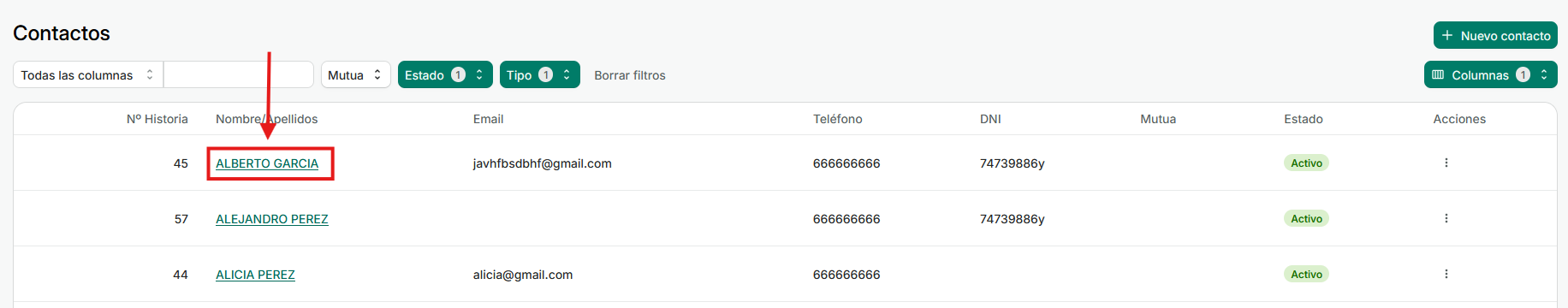 Para acceder a la ficha de nuestro contacto, debemos de clicar sobre su nombre: