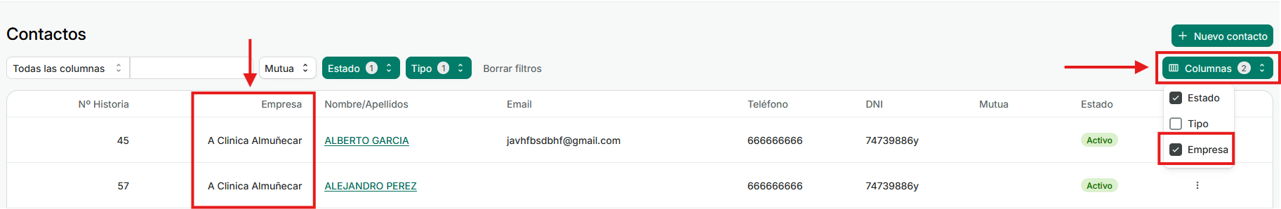 Si pertenece una franquicia, puede añadir la columna de Empresa, para saber de que centro es el paciente. Para ello clicamos en Columnas en la parte superior derecha y seleccionamos Empresa: