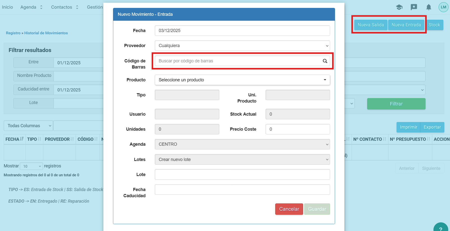 Cuando queramos hacer una entrada o salida de producto, desde Gestión > Registro > Stock, podremos buscar nuestro producto escaneando el código de barras:
