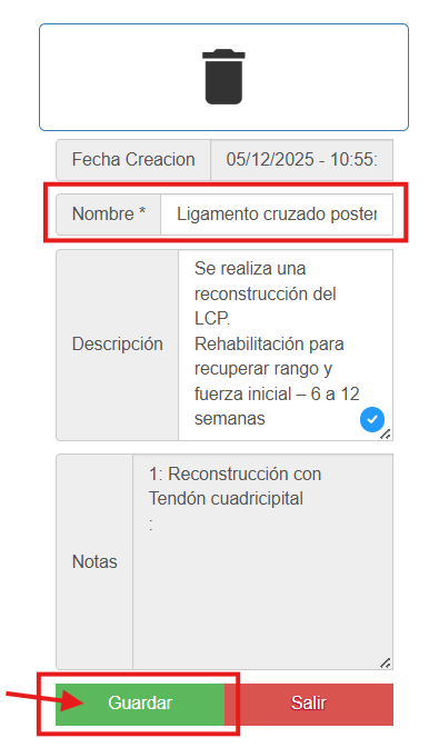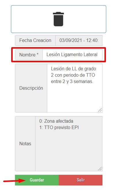 - Para finalizar el tratamiento, debemos rellenar el campo nombre, y pinchar sobre el botón de guardar.