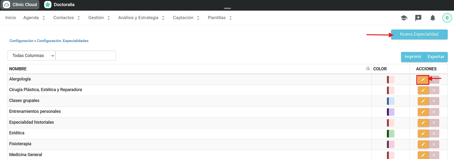 - Pinchamos sobre el botón de «Nueva Especialidad», o entramos en una de las especialidades que tengamos ya creadas con el lápiz de la derecha:
