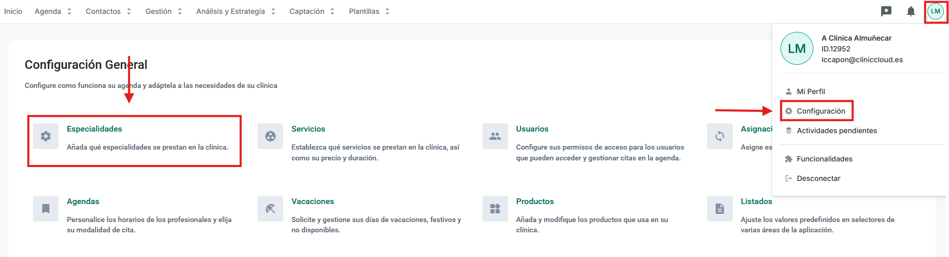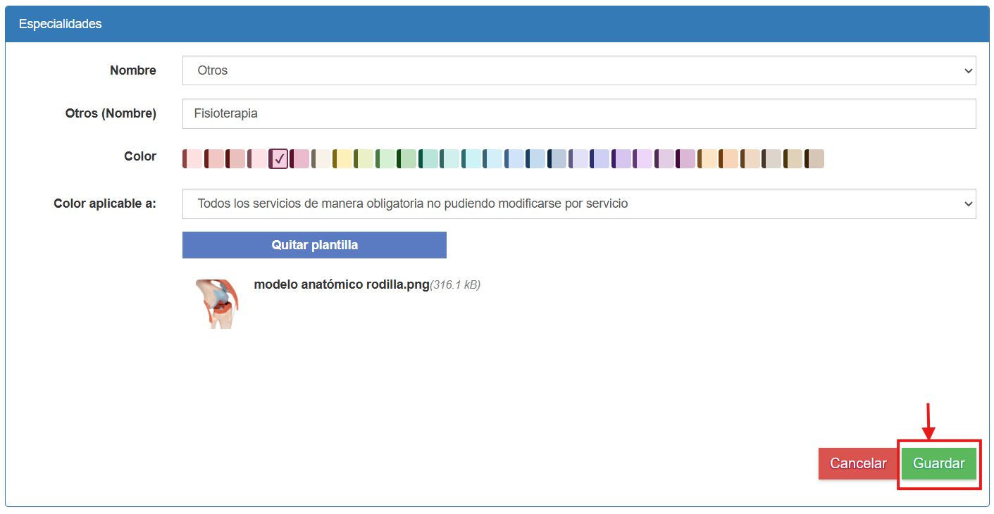 Para crear plantillas personalizadas para el modelo anatómico, debe de acceder en CONFIGURACIÓN > ESPECIALIDADES: