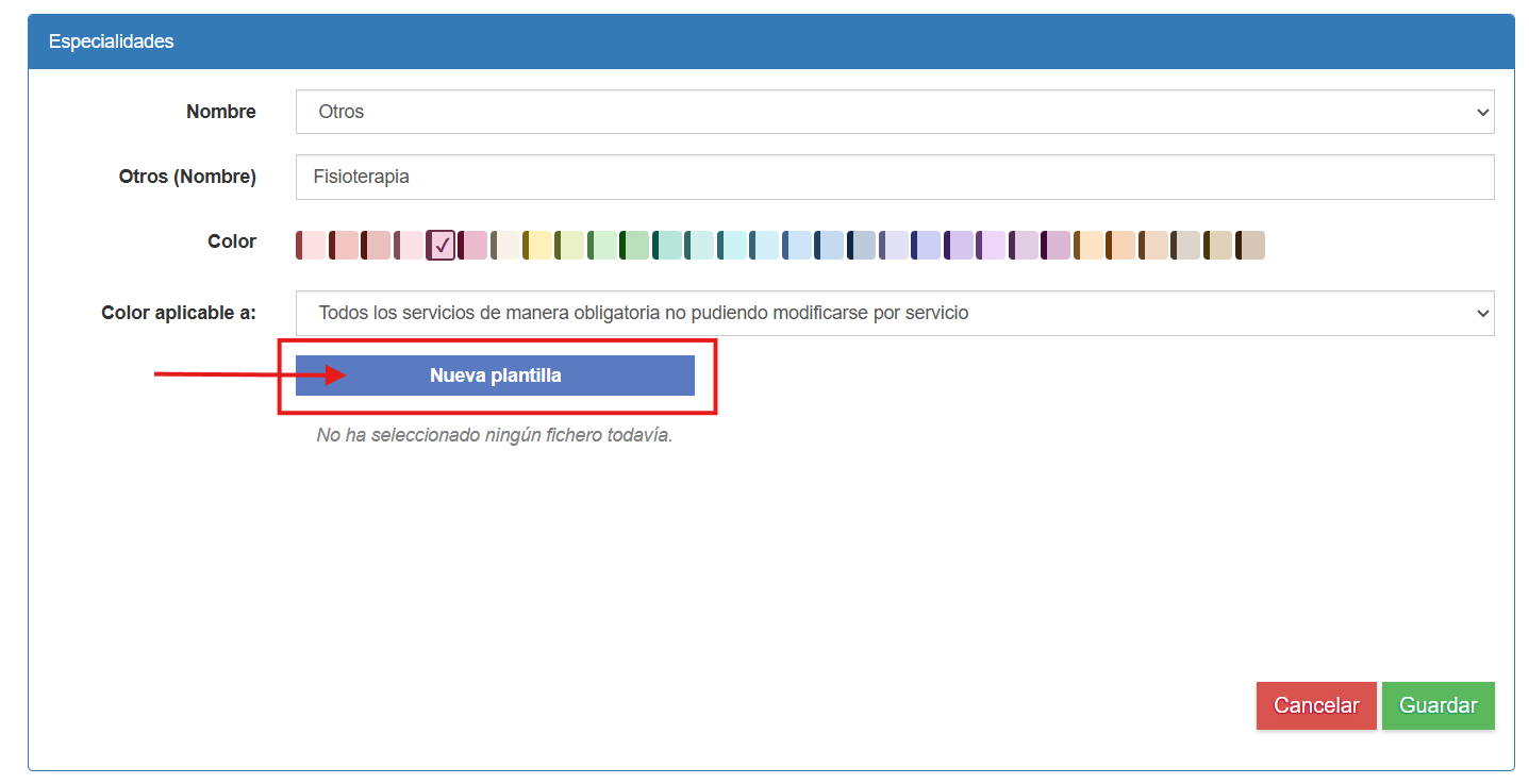 - Una vez creada la especialidad, pinchamos sobre el botón de NUEVA PLANTILLA, seleccionamos el archivo y Guardamos.