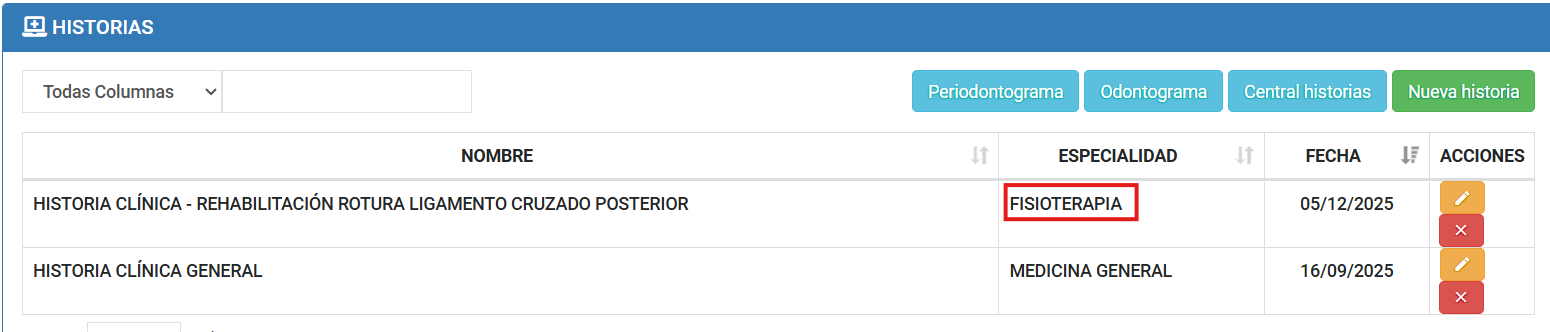 - Para poder usar la plantilla que hemos subido, al crear la historia debemos seleccionar la misma especialidad con la que hemos subido la plantilla.