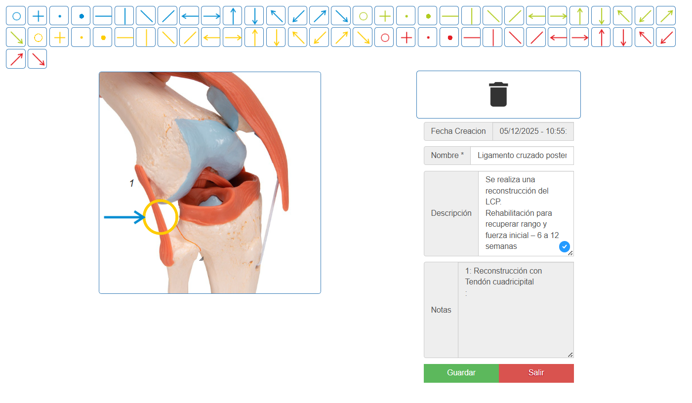Este módulo sirve para incluir dentro de sus historias modelos anatómicos personalizados para rellenar con información gráfica. Suba sus plantillas de imágenes personalizadas, modelos de pies, esqueletos, gráficas de crecimiento, etc. y marque en ellas sus actuaciones para un completo seguimiento clínico.