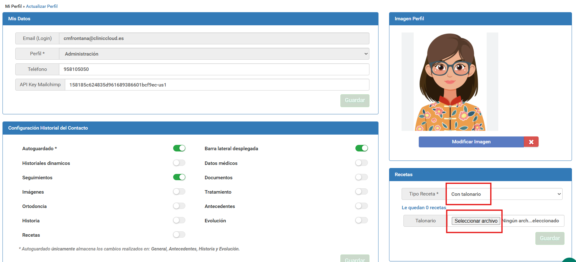 Puede solicitar en su colegio oficial el talonario de recetas en formato XML y subirlo a su perfil de usuario de Clinic Cloud. De ese modo, podrá emitir recetas oficiales desde su usuario en la aplicación y también podrá revisar el histórico recetado a un paciente de un solo vistazo (importante que no comparta su usuario con nadie más).