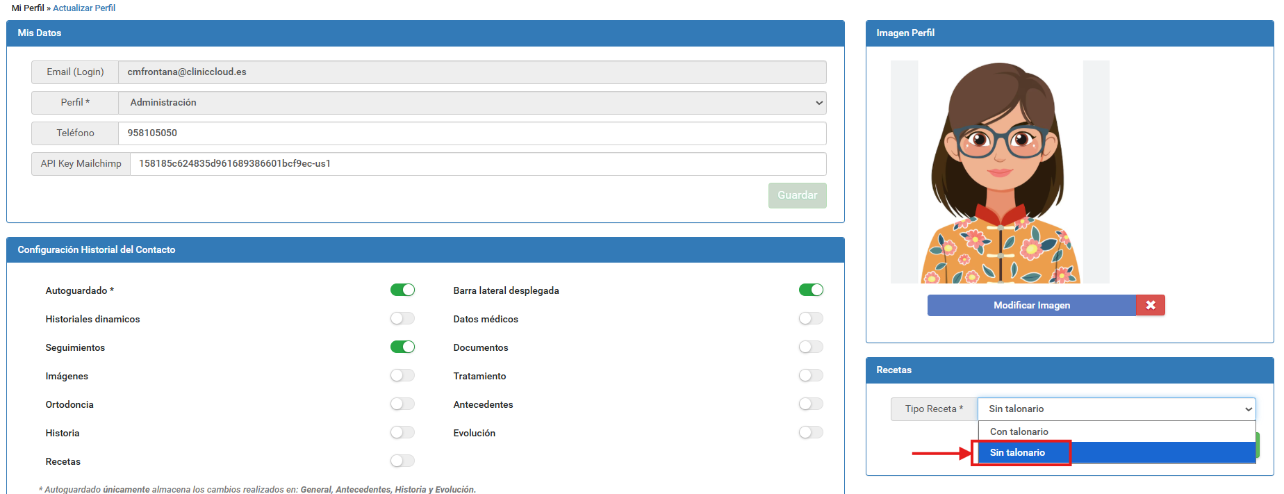 ***IMPORTANTE: Tenga en cuenta que los datos que aparecen en la receta (nombre fiscal, nif, nº de colegiado…) deberá rellenarlos también en la ficha de usuario desde el menú de Configuración-> Usuarios-> Datos Fiscales