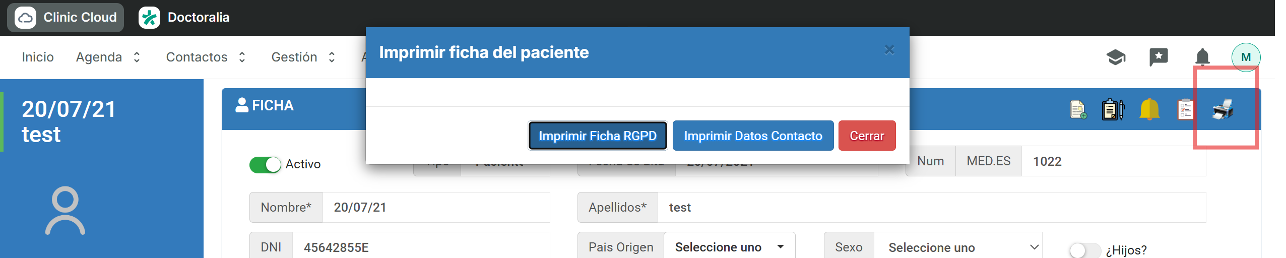 Imprimir: Desde la ficha de su contacto> Imprimir > Imprimir ficha RGPD, lo podrás imprimir para que el paciente lo firme.
