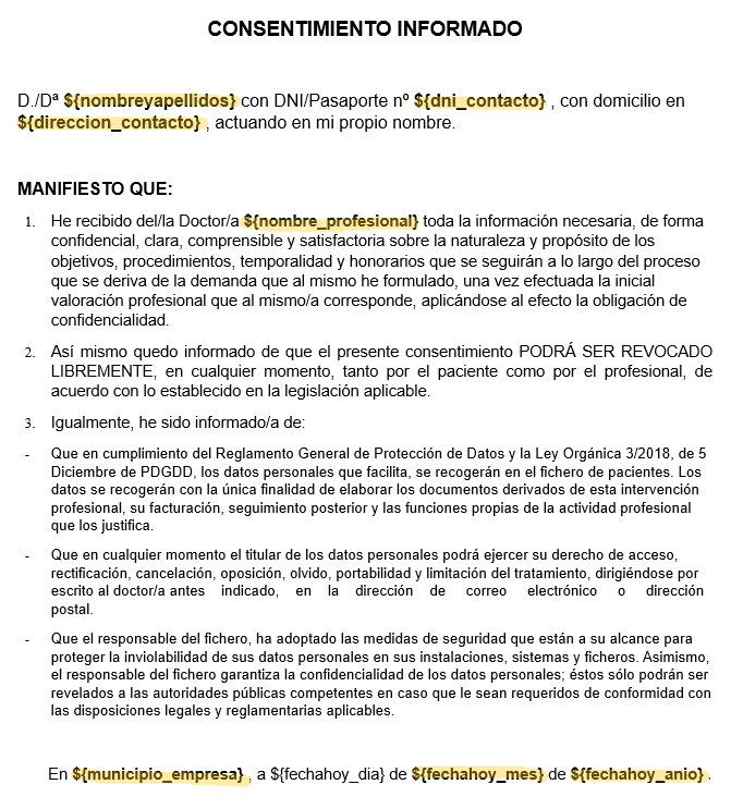 4- Antes de subir al sistema un documento con el texto del consentimiento informado en formato docx (word), sustituye los huecos de tu Word por esas variables.