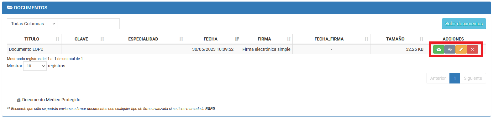 7. Desde el cuadro de acciones, podremos pulsar el icono de firma, con la modalidad de firma que tengamos disponible, para poder compartir el documento al paciente.