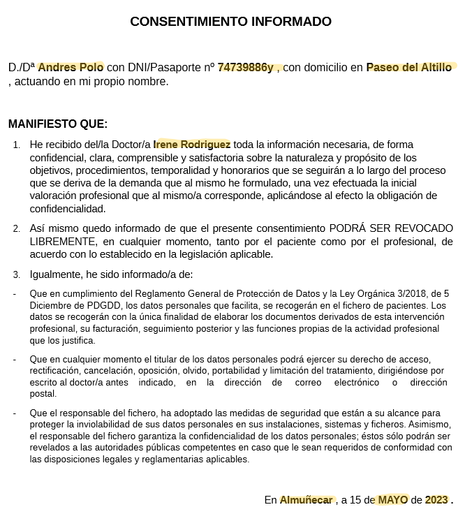 5. Tras pulsar, generar documento, los campos que añadiste, se autorellenarán automáticamente con los datos del paciente y ya estará disponible para firmar, como elijas. Aquí te mostramos un ejemplo 👇