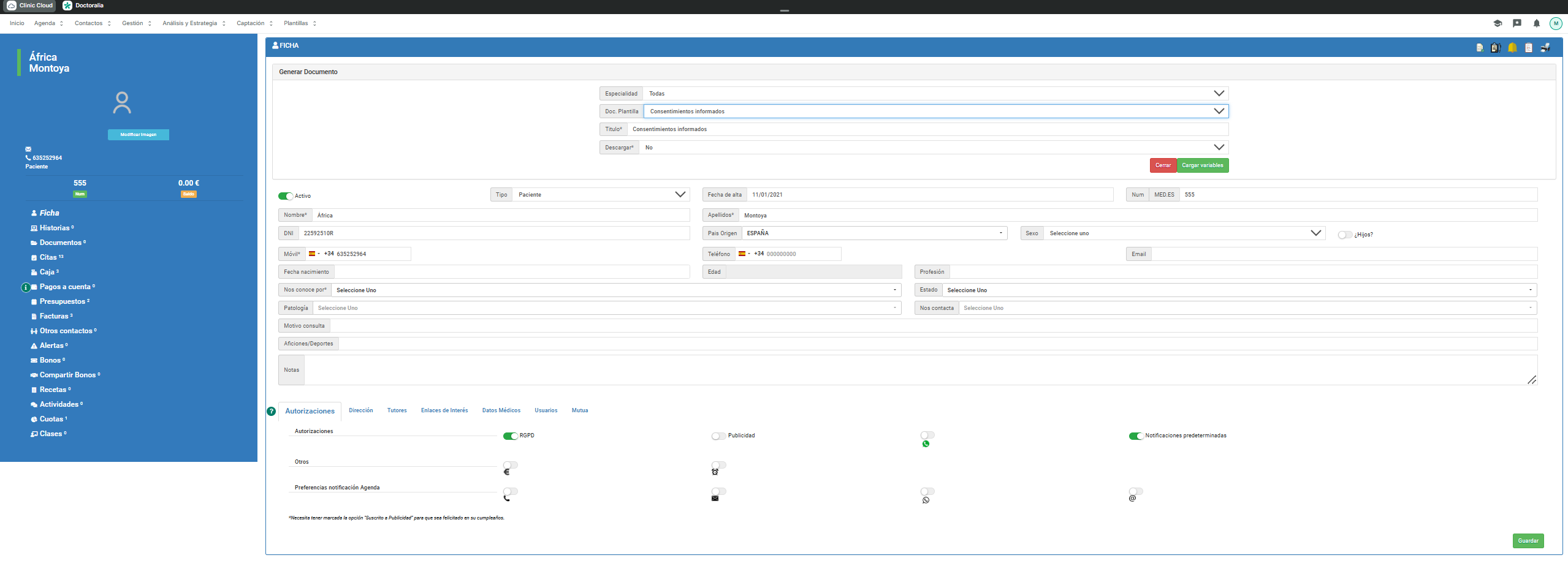 2- Accede a la ficha del paciente y verifica que tiene habilitada la autorización de RGPD.