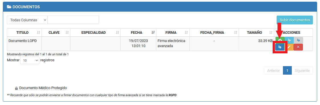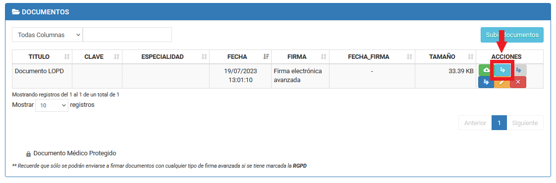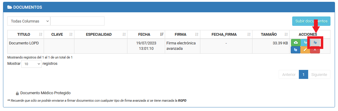 5- Accede a Documentos elige el tipo de firma que más te convenga, desde la columna de ACCIONES (iconos de la derecha).