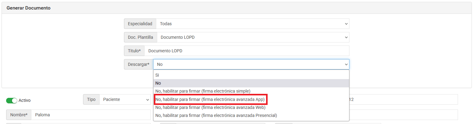 3- Elige el consentimiento informado que acabas de crear desde el selector Doc. Plantilla.