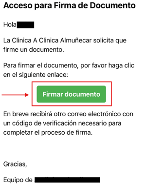 2- El paciente recibe el documento para su firma en su correo electrónico. Recibirá 2 correos: Un primer correo, con un código de acceso, que tendrá que añadir en el segundo, con el documento para firmar.