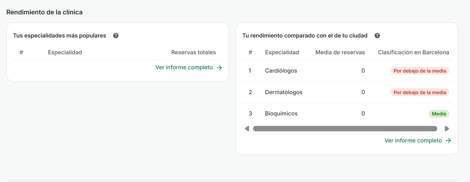 - Rendimiento de la clínica: Especialidades más populares y comparación con la media de tu ciudad.