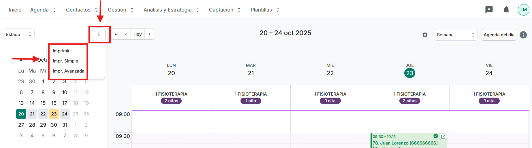 - Tres opciones de imprimir la agenda: «IMPRIMIR», «IMPRIMIR SIMPLE» e «IMPRIMIR SIMPLE 2». Las tres opciones imprimen la agenda del día que estemos visualizando, pero cada impresión incluirá más o menos información: