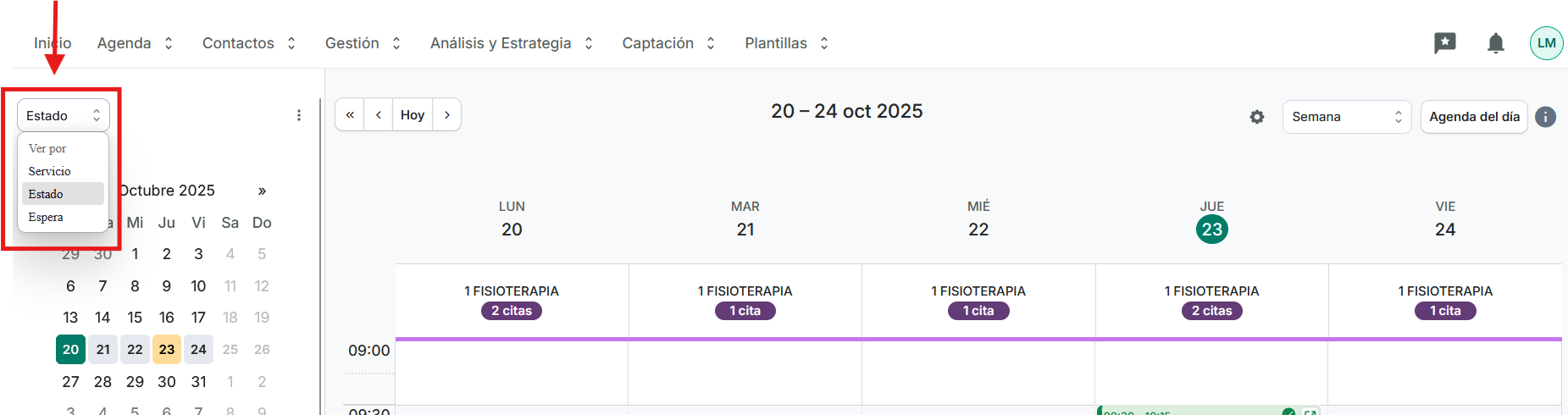 - Las opciones de ver la agenda por: servicio (color del servicio configurado), estado (estado económico de la cita) o espera (paciente en sala de espera):