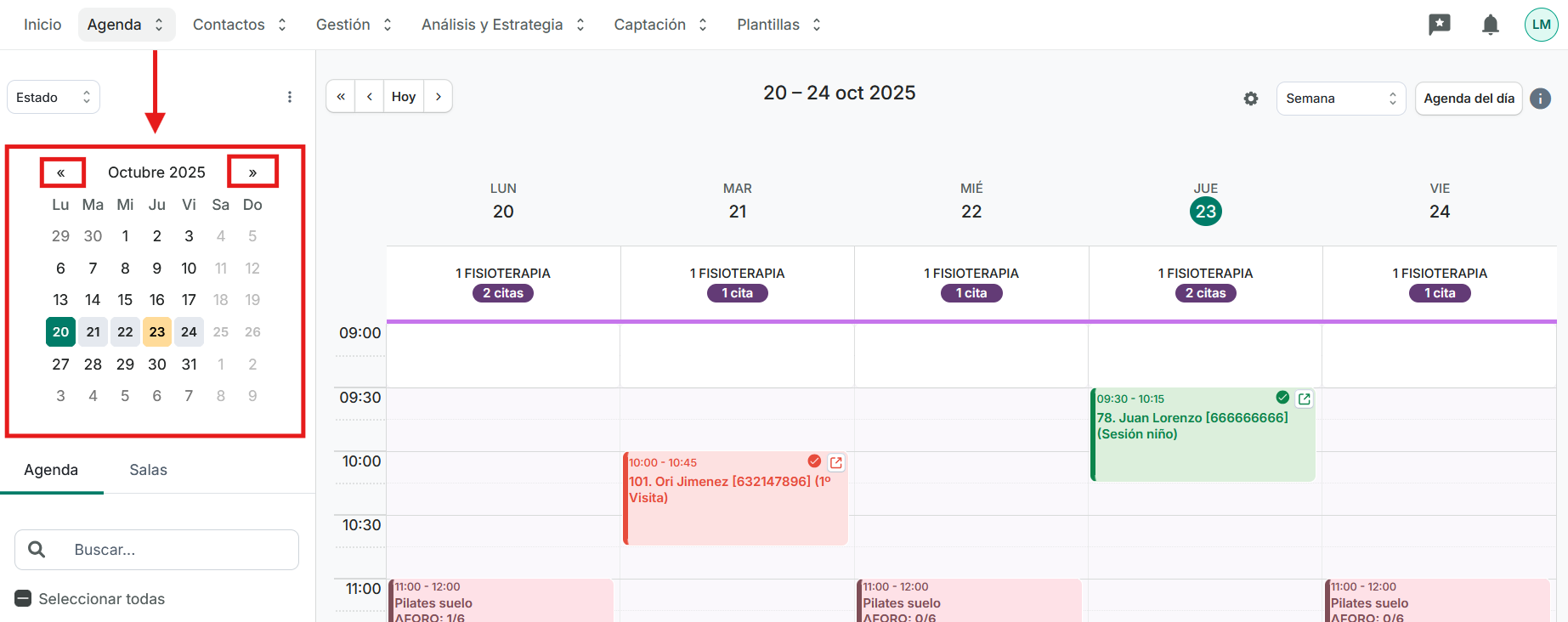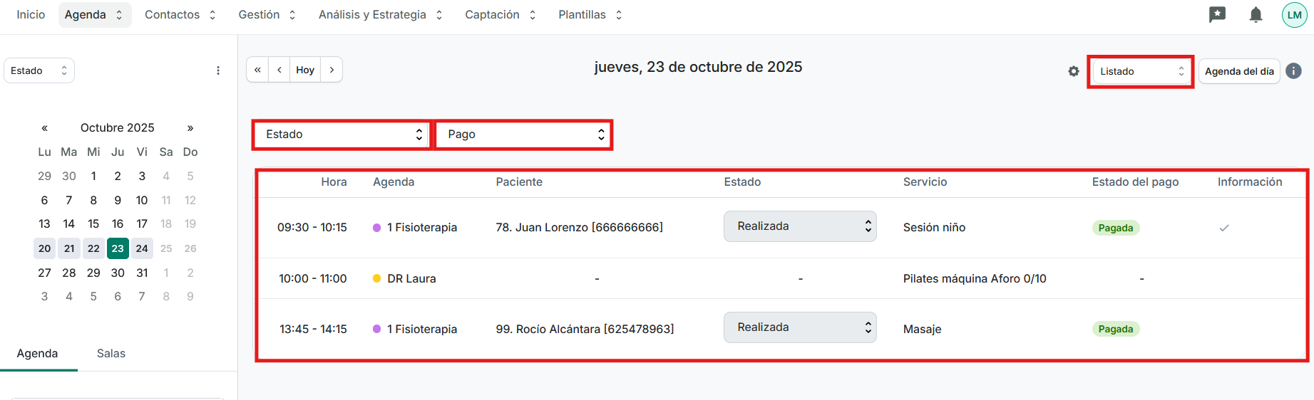 Además podremos filtrar las citas por su estado y su morosidad.