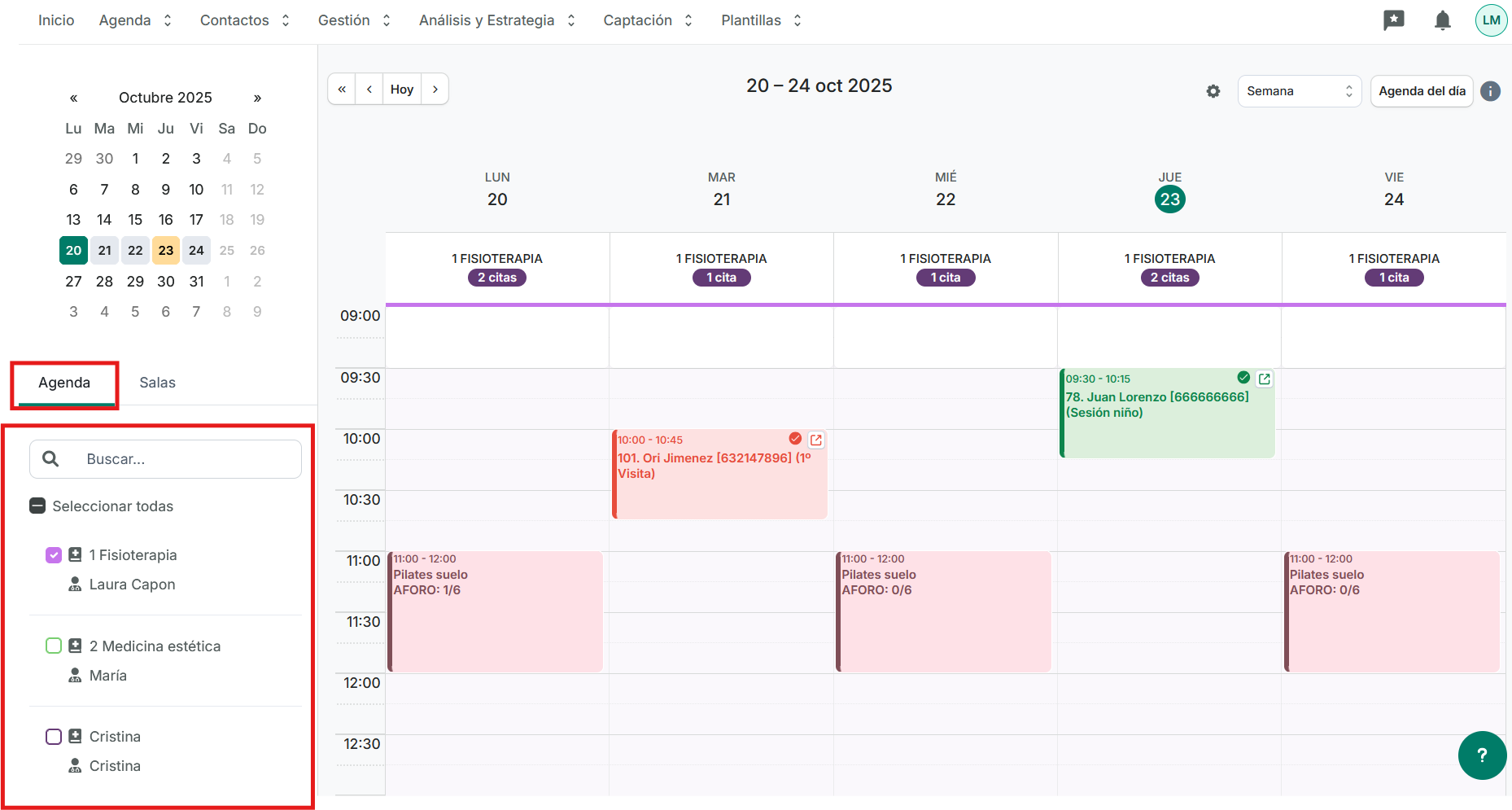- Y por último, la agenda del profesional o profesionales que tengamos seleccionadas en ese momento: