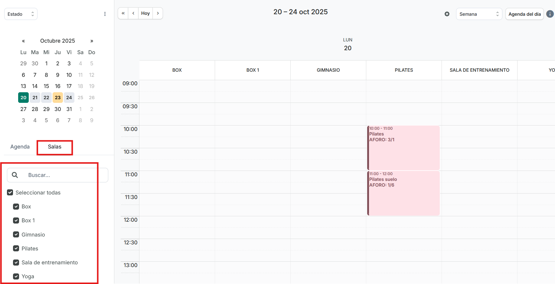 - Podemos acceder a las salas, y al igual que con las agendas, podemos seleccionar todas las salas o solo aquellas que queramos visualizar: