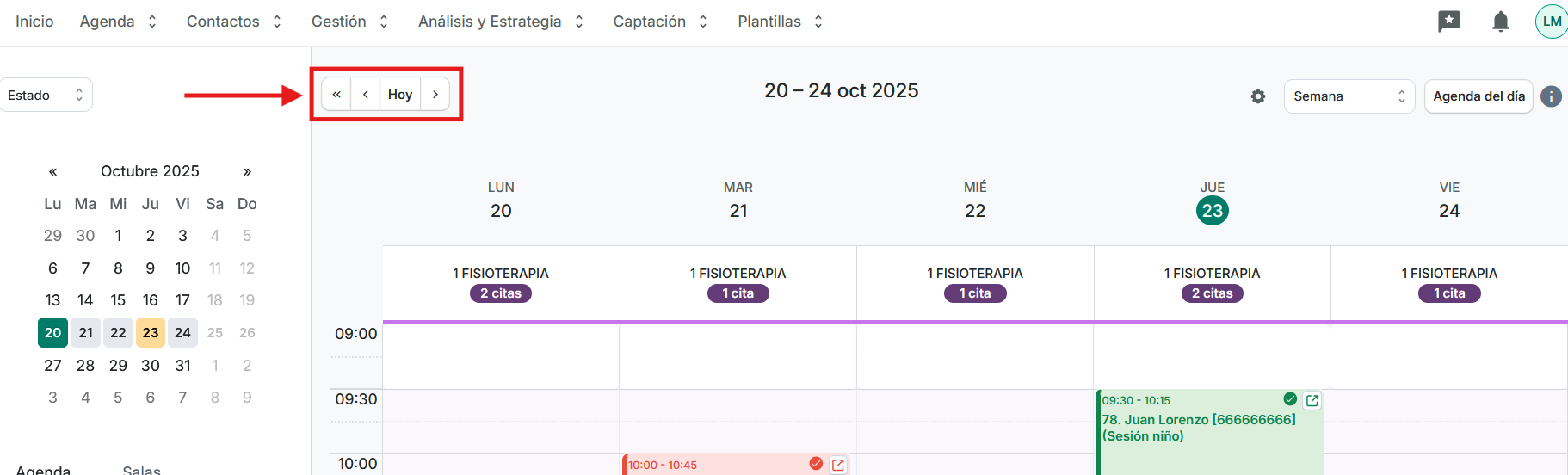 - Siempre que estamos visualizando el día actual en la agenda, veremos una línea roja horizontal que atraviesa todas las agendas que nos indica la hora actual, de esta manera vemos si nos estamos acercando a la hora de una cita agendada: