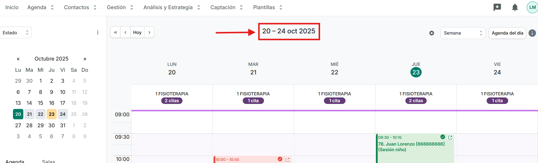- La opción de ver la agenda por: meses (6 meses), mes, semana y día. Y las opciones de: Listado, Disponibilidad y Plan diario. Para acceder a la FAQ de Disponibilidad clique AQUÍ.
