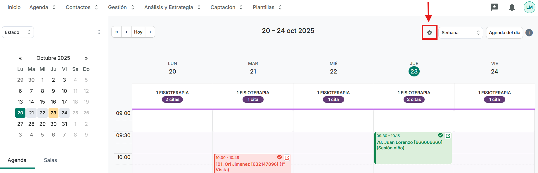 Podemos configurar las preferencias y visual de nuestra agenda desde el símbolo de configuración que encontramos en la propia agenda: