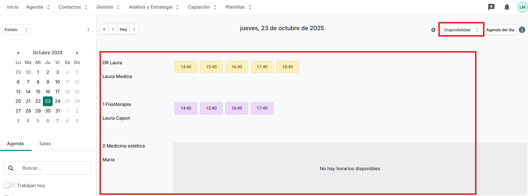 El funcionamiento es muy sencillo, clicaremos en DISPONIBILIDAD, marcaremos la o las agendas que queramos visualizar y ya podremos ver sus huecos disponibles: