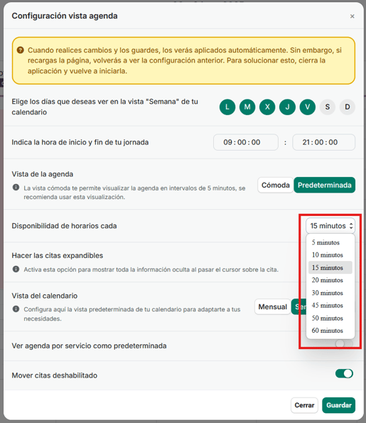 - Disponibilidad de horarios cada: 5, 10, 15, 20, 30, 45, 50 y 60 minutos. Podemos elegir el intervalo que más se ajuste a la duración de nuestras citas.