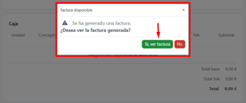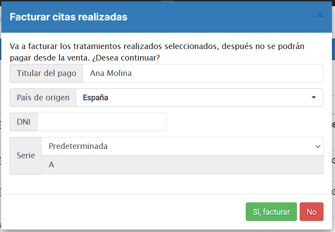 Paso 2. Cuando clicamos en Facturar nos aparecerá el siguiente mensaje 👇Rellena los datos y selecciona Si, facturar.