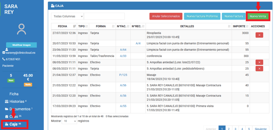 Paso 1: Si queremos realizar un cobro desde la ficha del paciente y facturarlo debemos acceder al apartado de CAJA y clicamos en NUEVA VENTA.