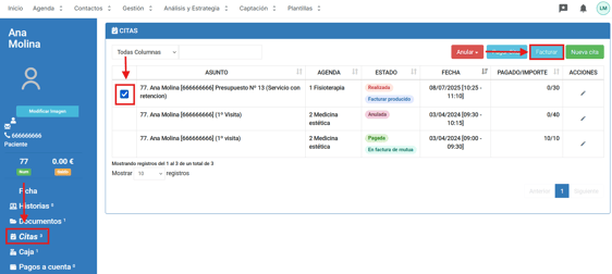 Paso 1. Desde la ficha del paciente, accede al apartado CITAS. Marcamos la cita que queremos facturar y clicamos en Facturar: