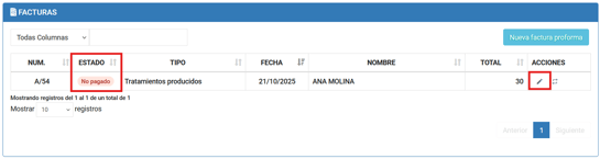 Paso 1. Para abonar estas facturas debemos de acceder a la propia factura. Veremos que estas facturas tienen el estado de "No pagado":