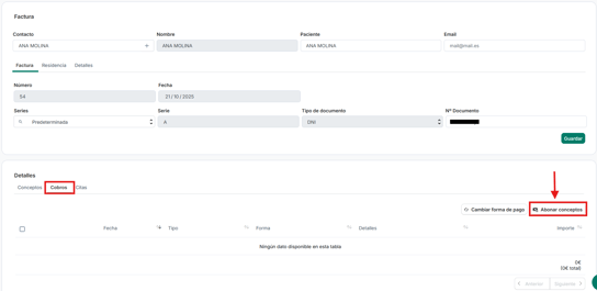 Paso 2. Dentro de la factura, nos vamos al apartado "Cobros" y clicamos en "Abonar conceptos":