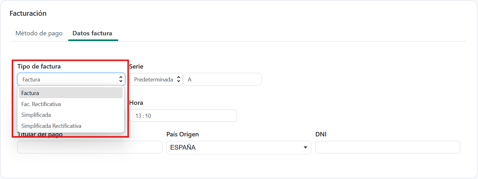Elegir tipo de factura: Factura, Rectificativa (devolución) o Simplificada (si está activada)