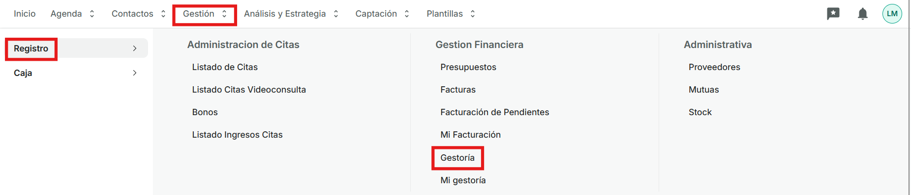 En primer lugar debemos acceder a GESTIÓN > REGISTRO > GESTORÍA: