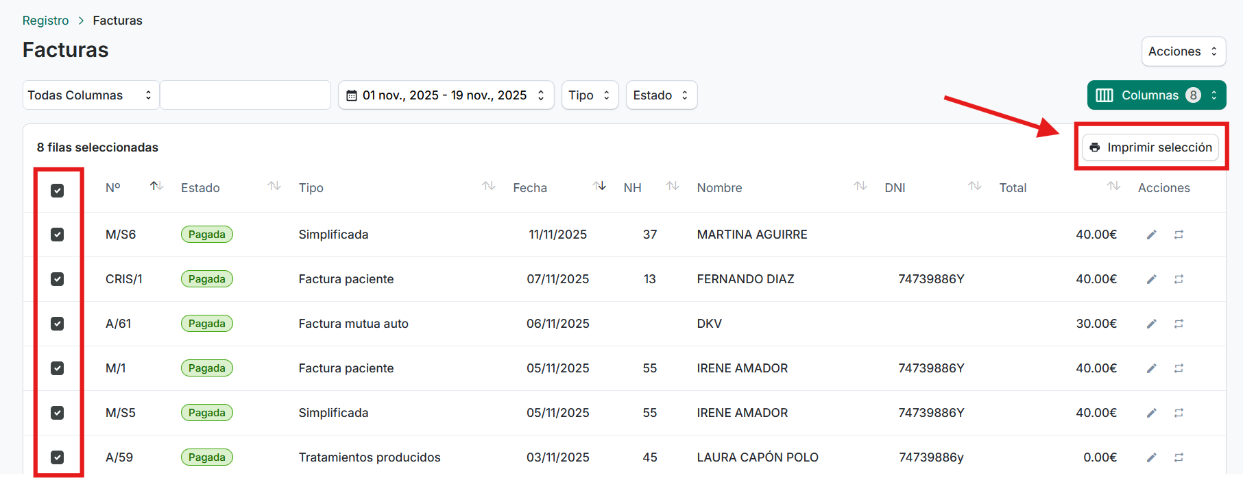 Filtraremos las Facturas en el rango de fechas deseado, seleccionamos todas nuestras facturas y a continuación clicamos en IMPRIMIR SELECCIÓN: