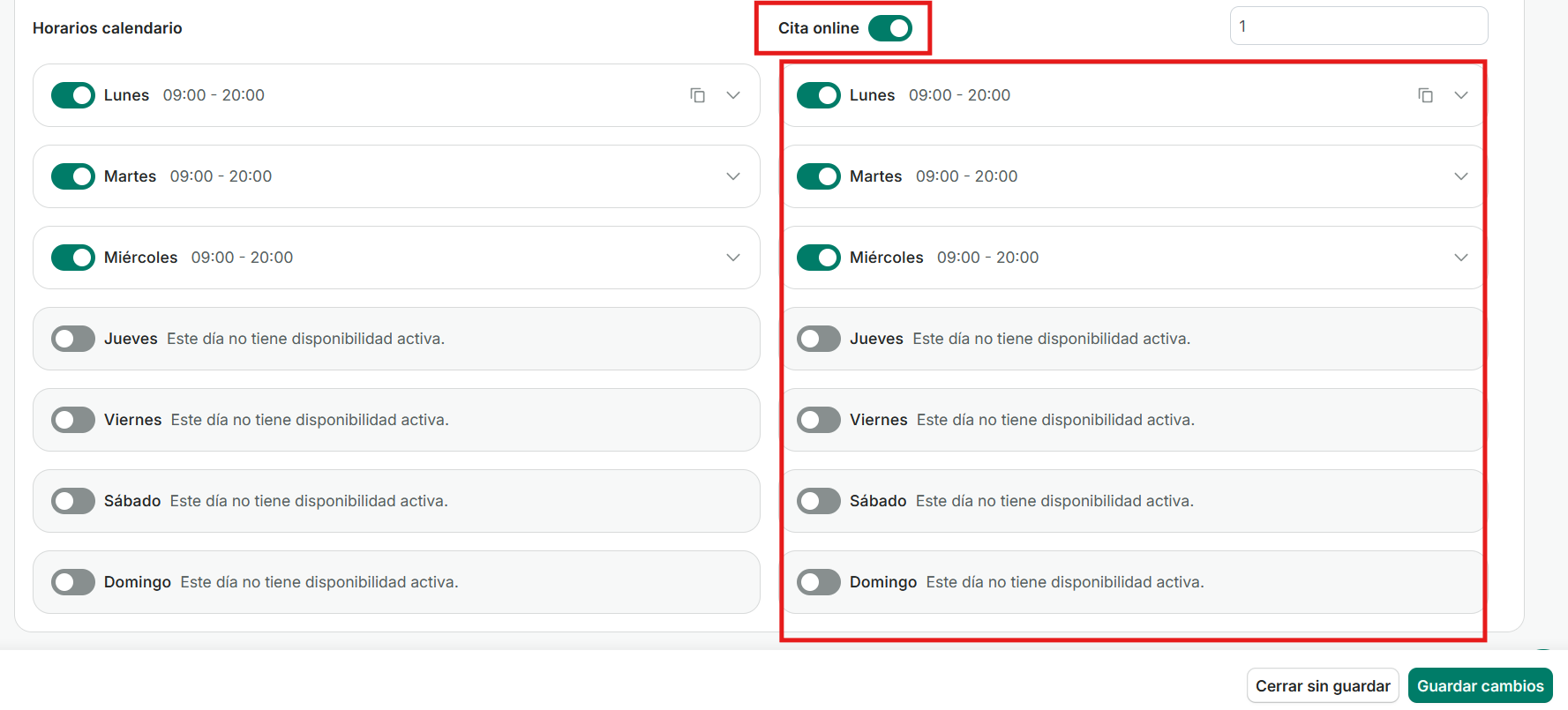 Al activar Cita Online, se desplegará el horario para dicha cita online. En el panel a la derecha, dispondrá de los horarios relativos a la Cita Online. Puede coincidir con la agenda normal u ofrecer una disponibilidad menor: