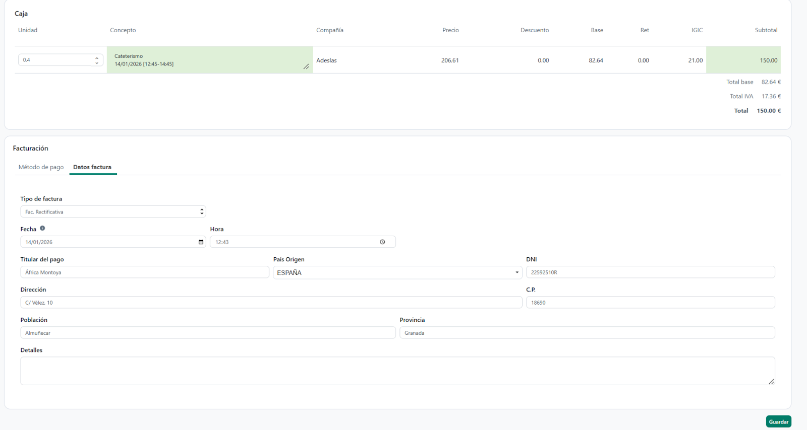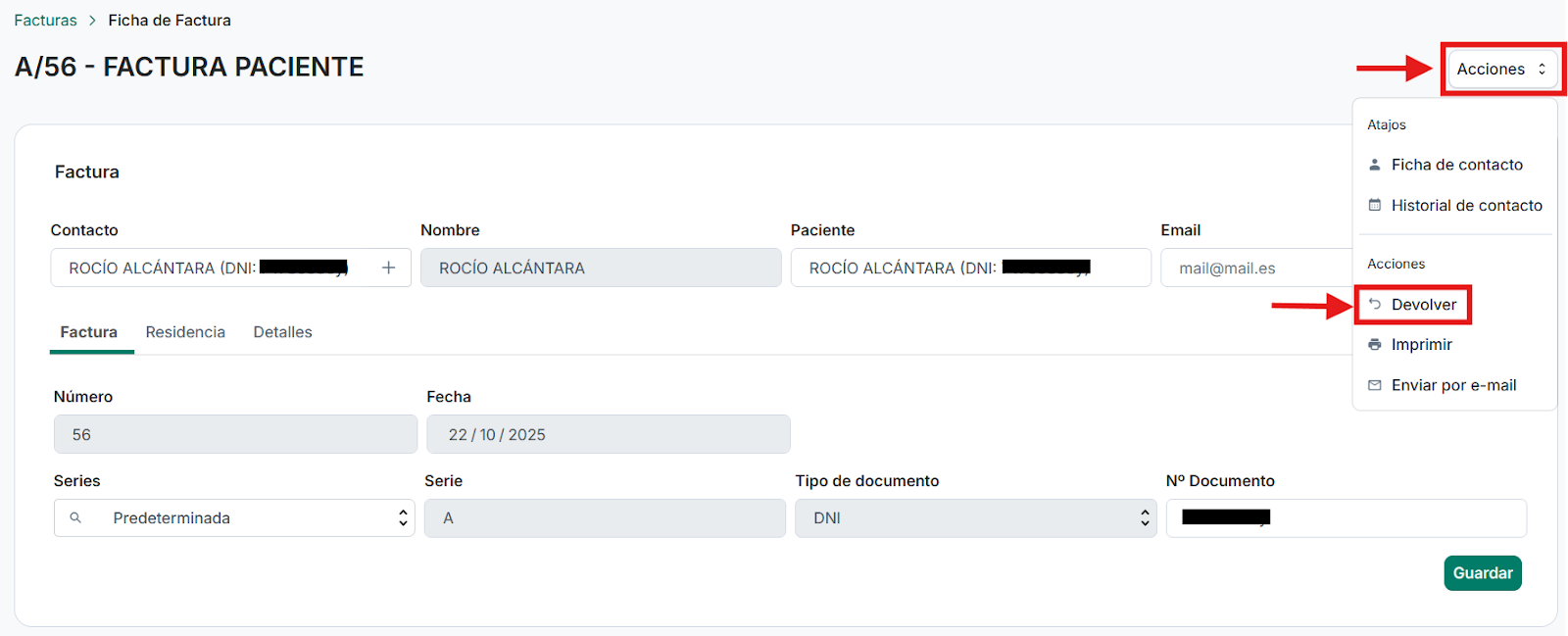 Resultado: Se genera automáticamente una Factura Rectificativa parcial. La devolución queda registrada en Facturas y Caja, asociada al paciente (y profesional, si aplica) y correctamente reflejada a nivel fiscal