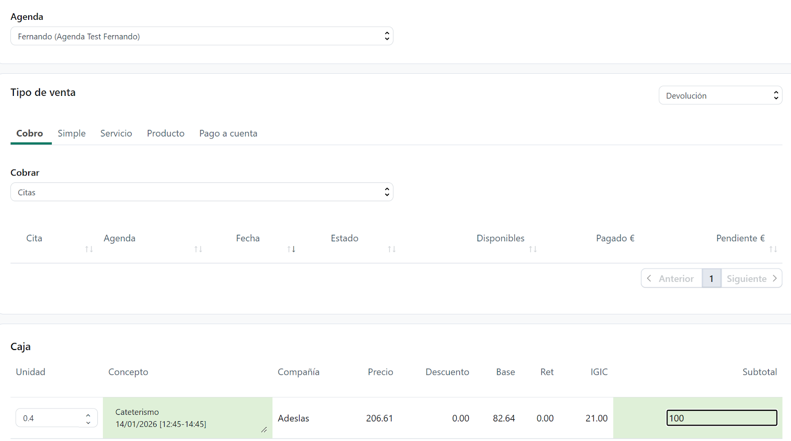 ⚠️ Importante: Si la devolución debe estar asociada a un profesional, debes seleccionarlo en el desplegable de Agenda. De esta forma, la devolución quedará correctamente vinculada al usuario.