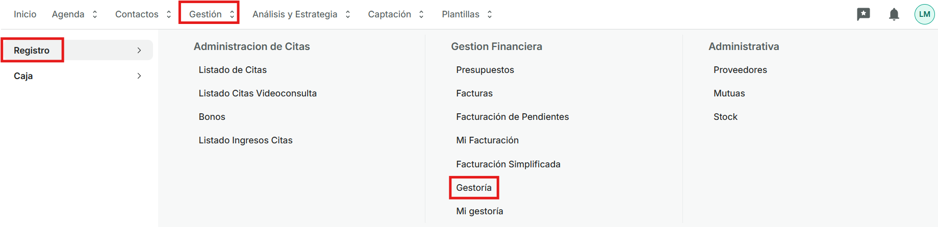 La gestoría es un módulo en el que podemos obtener todos los datos de facturación emitida y soportada por el centro. Desde Gestión >Registro > Gestoría: