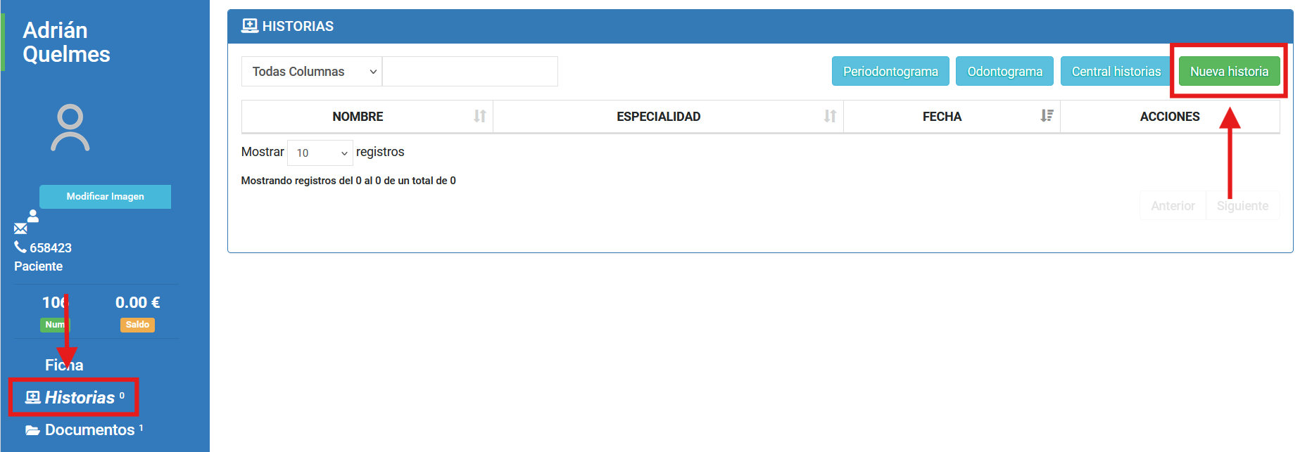 Para crear una historia clínica, nos iremos a la ficha del paciente al apartado de Historias y clicaremos en Nueva Historia: