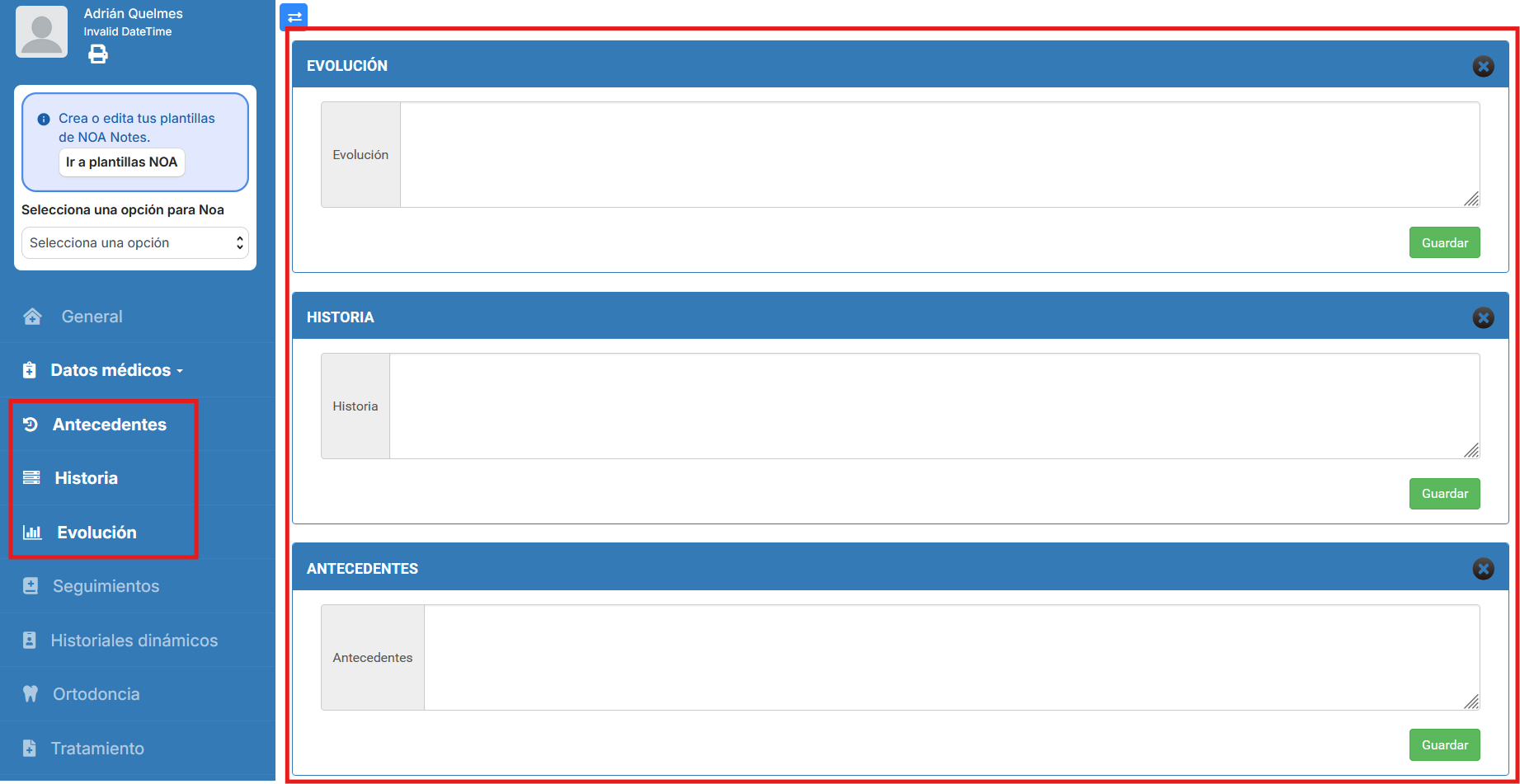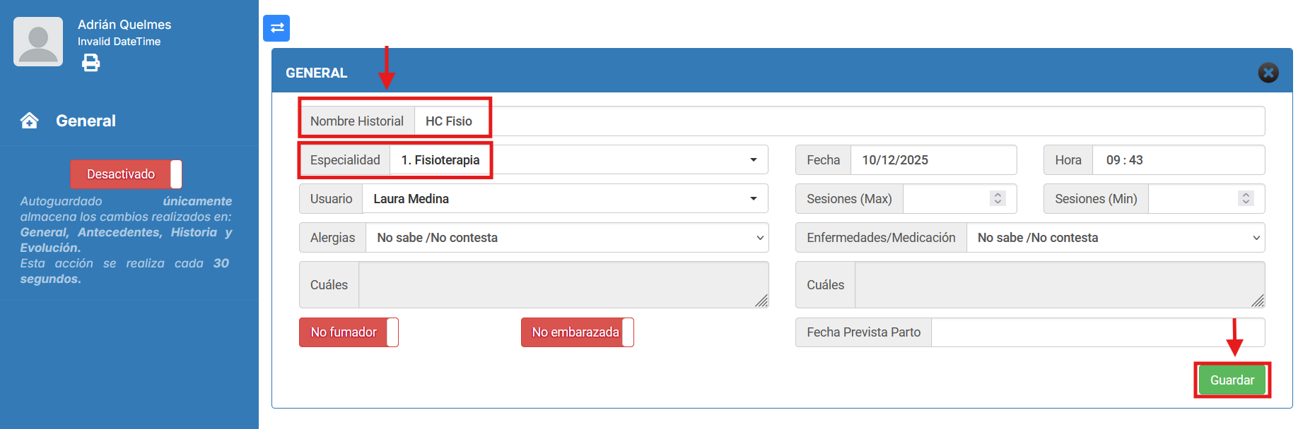 Debemos de ponerle un nombre a la historia clínica, elegir una especialidad y guardar para crear la historia: