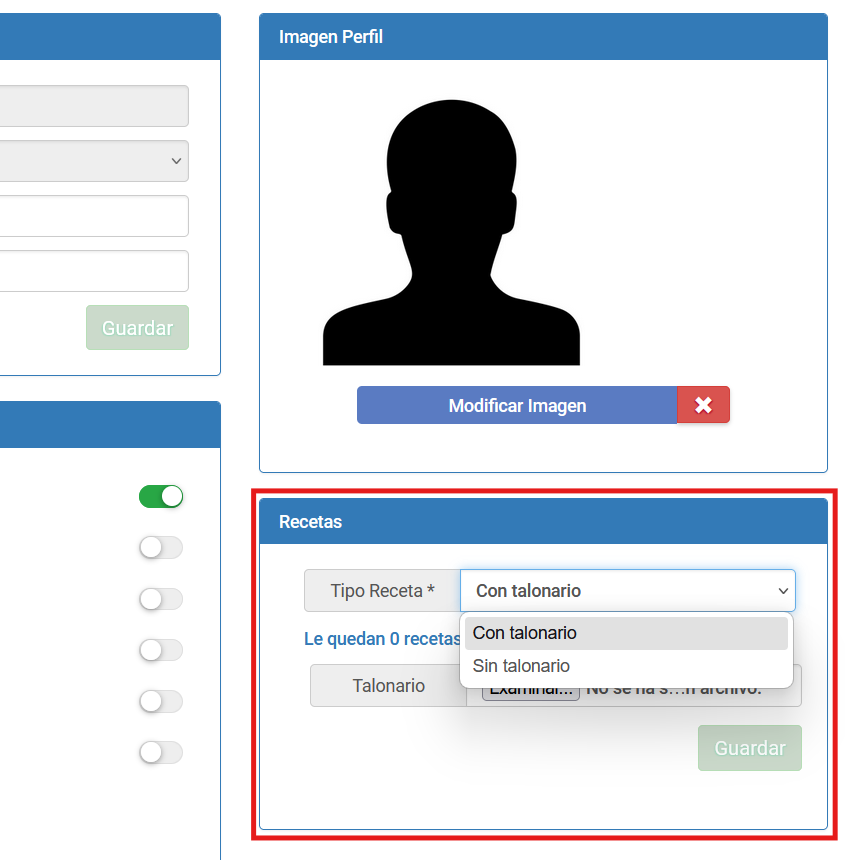 Tendremos opción de insertar nuestro talonario de recetas del colegio de médicos dentro de las preferencias del perfil o en caso de no disponer del talonario en XML podremos escoger la opción de Recetas sin talonario.