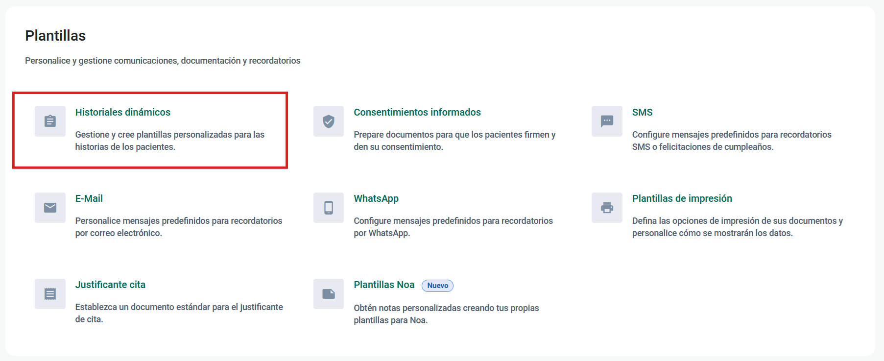 Para empezar a gestionar y definir sus Plantillas de Preguntas sólo tiene que ir a la sección de Configuración y pinchar en la opción Plantilla > Historiales dinámicos: